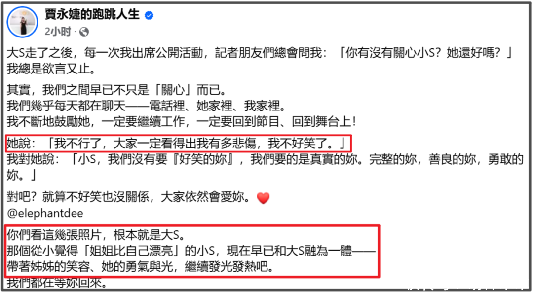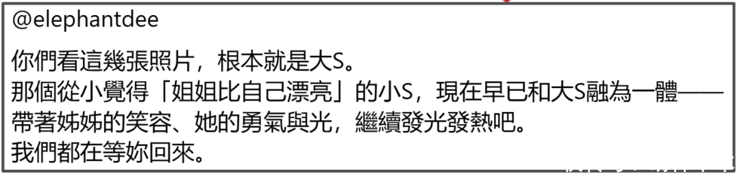 贾永婕还借此来鼓励小S,说小S小时候觉得“姐姐比自己漂亮”,现在早就和姐姐融为一体,希望她能带着大S的笑容、勇敢和光继续发光发热,我们都在等你回来。