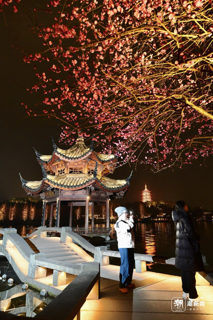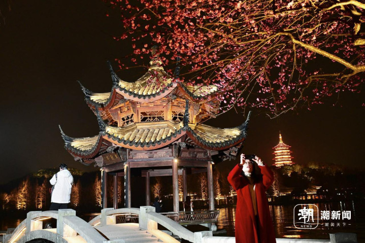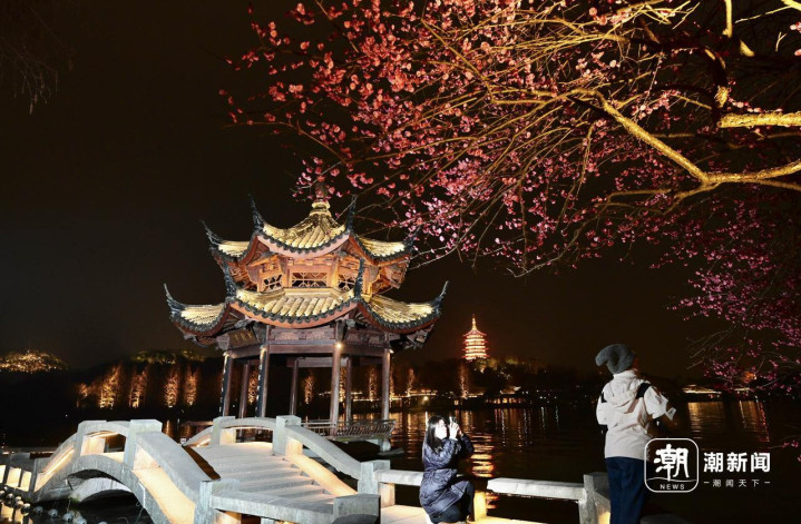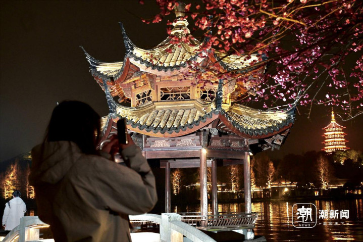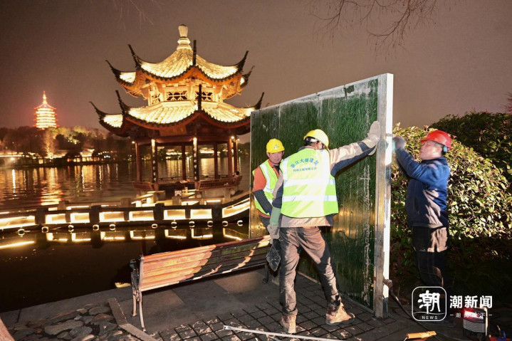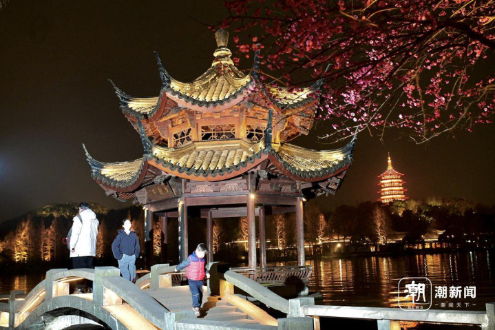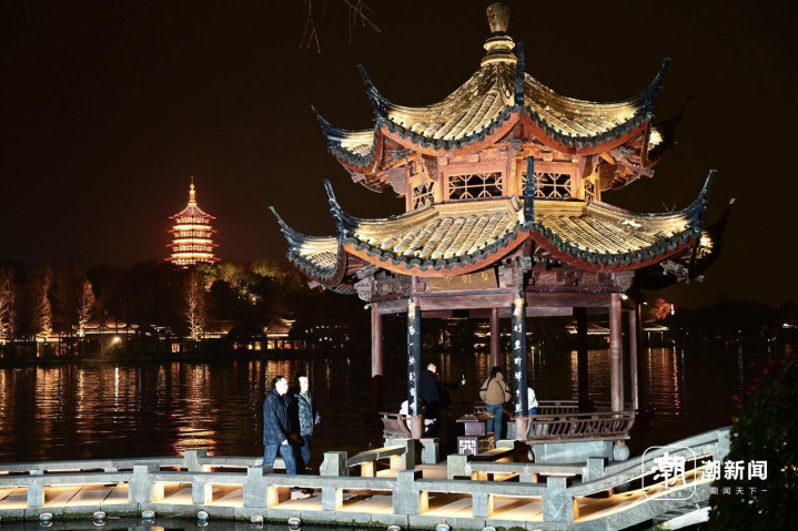 2月25日傍晚,游客在杭州西湖夕影亭欣赏华灯初上的雷峰塔,施工人员搭建工地围挡。26日起,这里将开始纠偏维护施工。夕影亭位于长桥公园,建于2002年,是一座八柱重檐攒尖顶的木结构(榫卯连接)亭子。由于亭子基础承台深入湖中,长期受湖水扰动影响,在日常观测过程中发现有轻微倾斜现象。经专业机构鉴定和监测表明,亭子本体基本稳定安全,从长远安全性考虑,凤凰山管理处将对夕影亭实施纠偏维护工程。施工期间,夕影亭及双投桥区域将封闭,工程预计将在今年4月底完工。